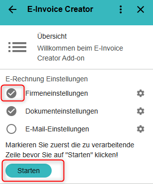 Sofern Sie die notwendigen Angaben in den Firmeneinstellungen vorgenommen haben und Angaben zu einer neuen Rechnung in einer neuen Zeile in den Rechnungsdaten und Positionsdaten gemacht haben, können Sie die Verarbeitung für diesen neuen Eintrag starten. Markieren Sie dazu diese Zeile im Tabellenblatt “Rechnungsdaten” und starten Sie anschließend die Verarbeitung über den Starten-Button!
