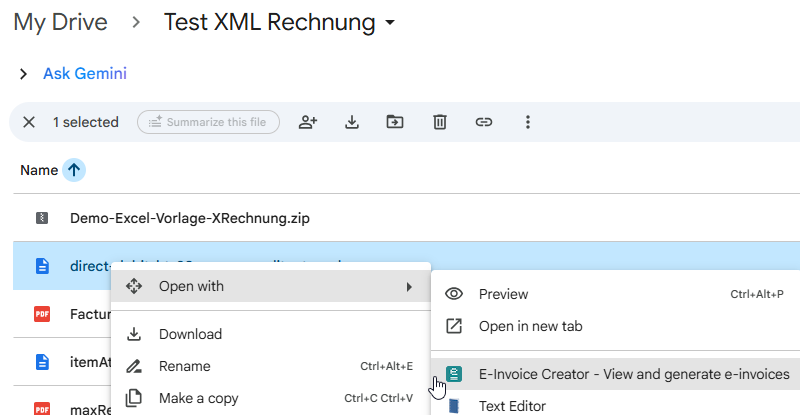 You can also start the Viewer directly via the context menu in Google Drive. Simply right-click on an e-invoice stored in Google Drive. Then open the Viewer directly via: ‚Open with –> E-Invoice Creator‘ as shown in the following image