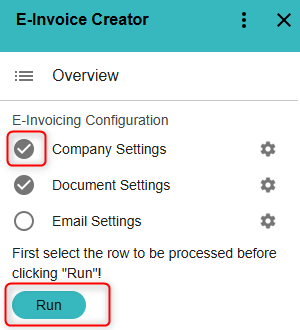 Provided you have entered the necessary information in the Company Settings and provided details for a new invoice in a new row in the Invoice Data and Position Data sheets, you can start the processing for this new entry. To do this, select this row in the ‚Invoice Data‘ sheet and then start the processing via the Start button!