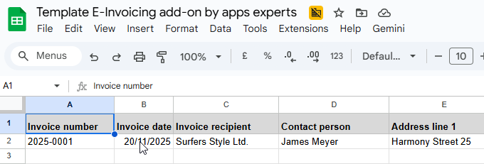 Before you can start the processing, you only need to maintain your invoice and position data according to the copied spreadsheet template. Please note that the bold table headers, such as Invoice Number, Invoice Date, Contact Person, etc., are all mandatory fields and must be maintained, as otherwise, the creation of a standard-compliant e-invoice is not possible!